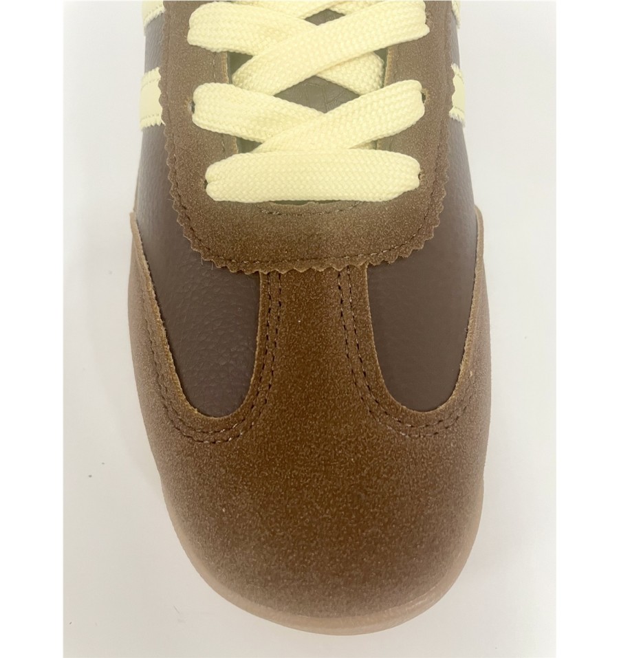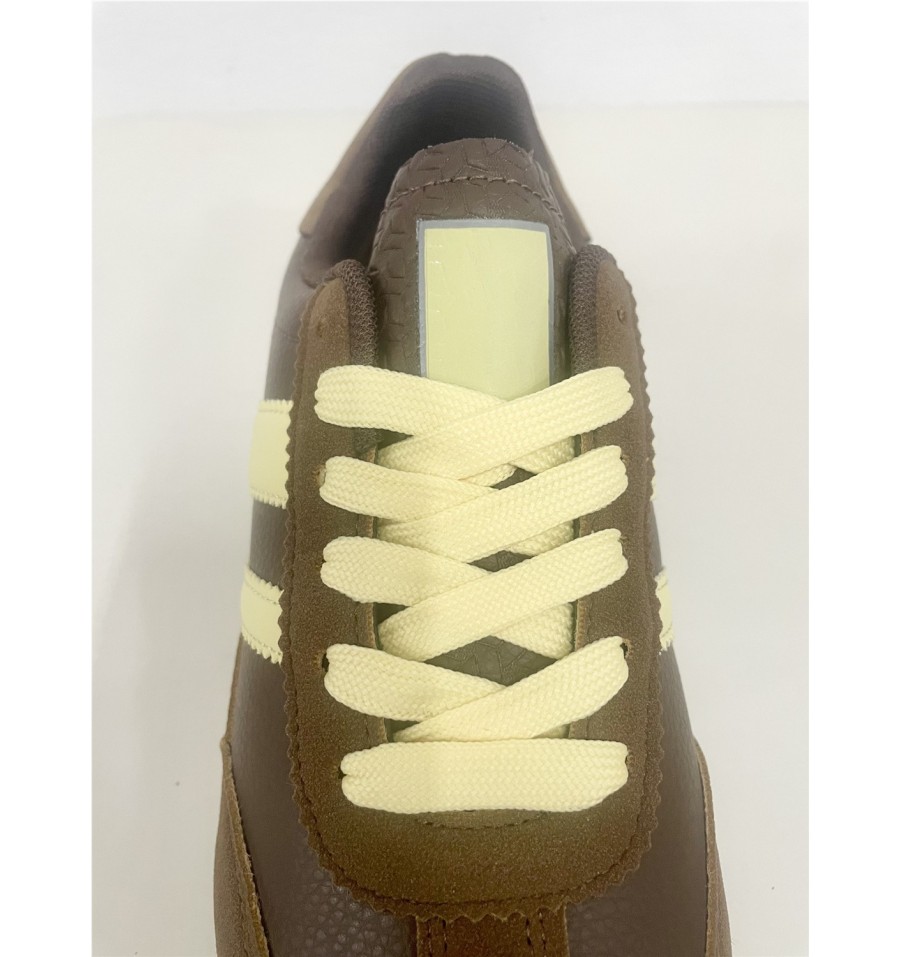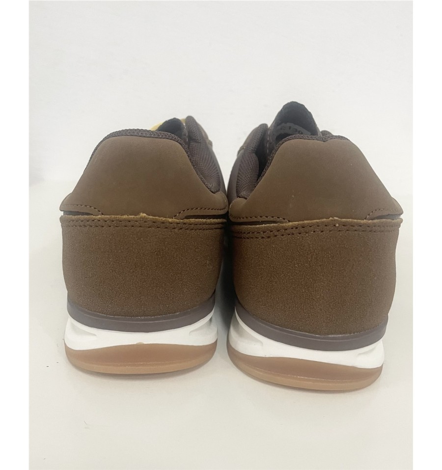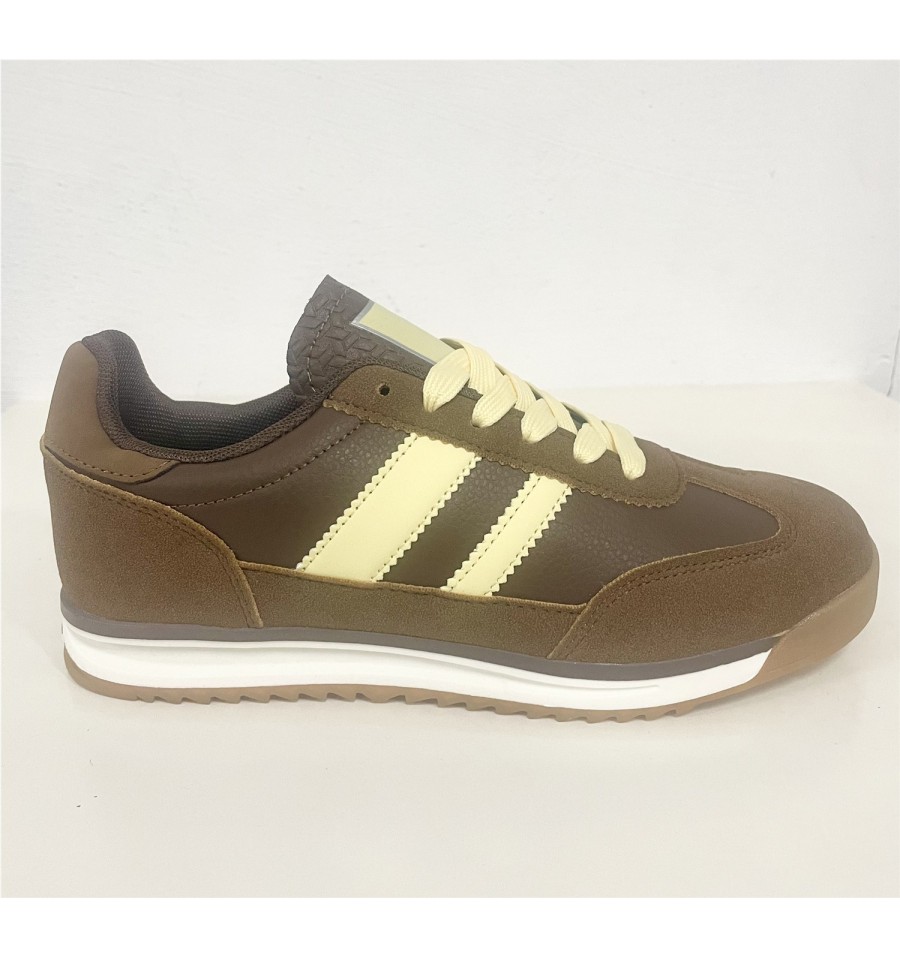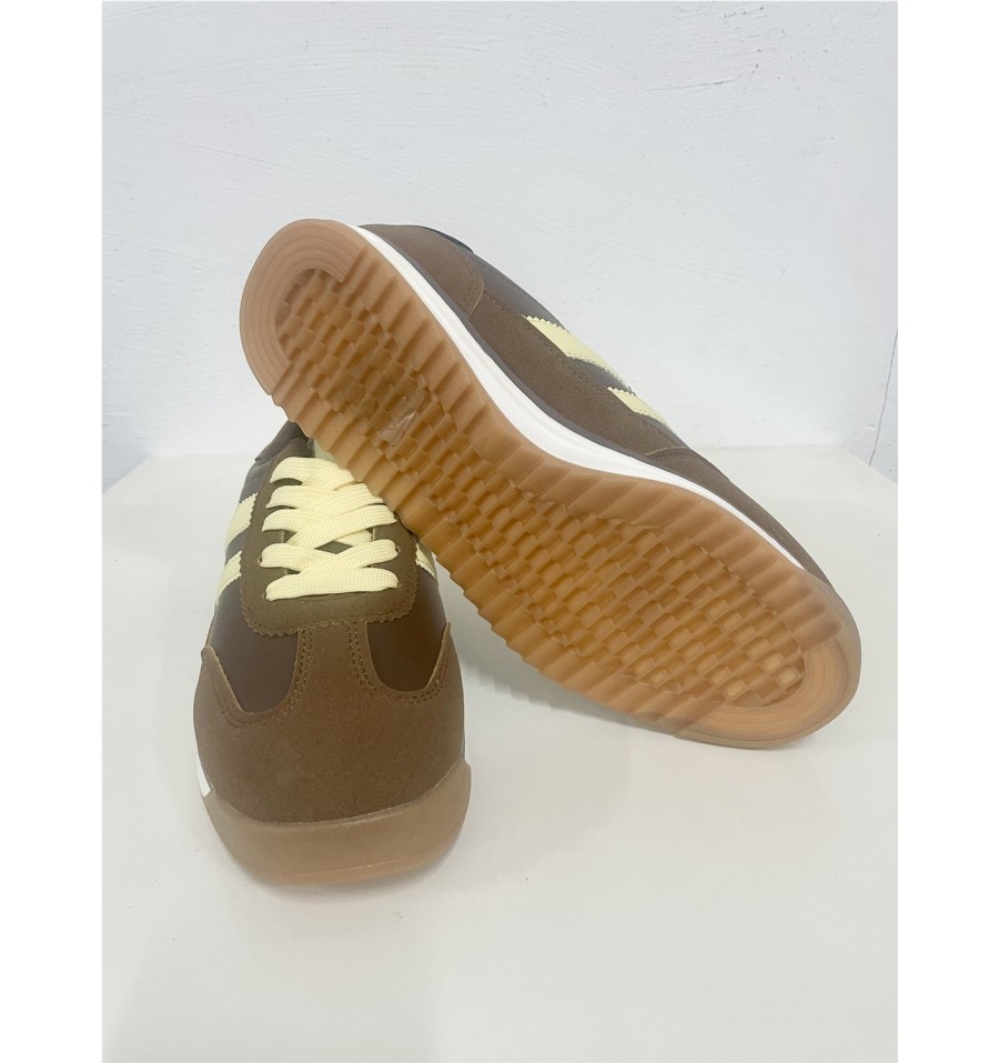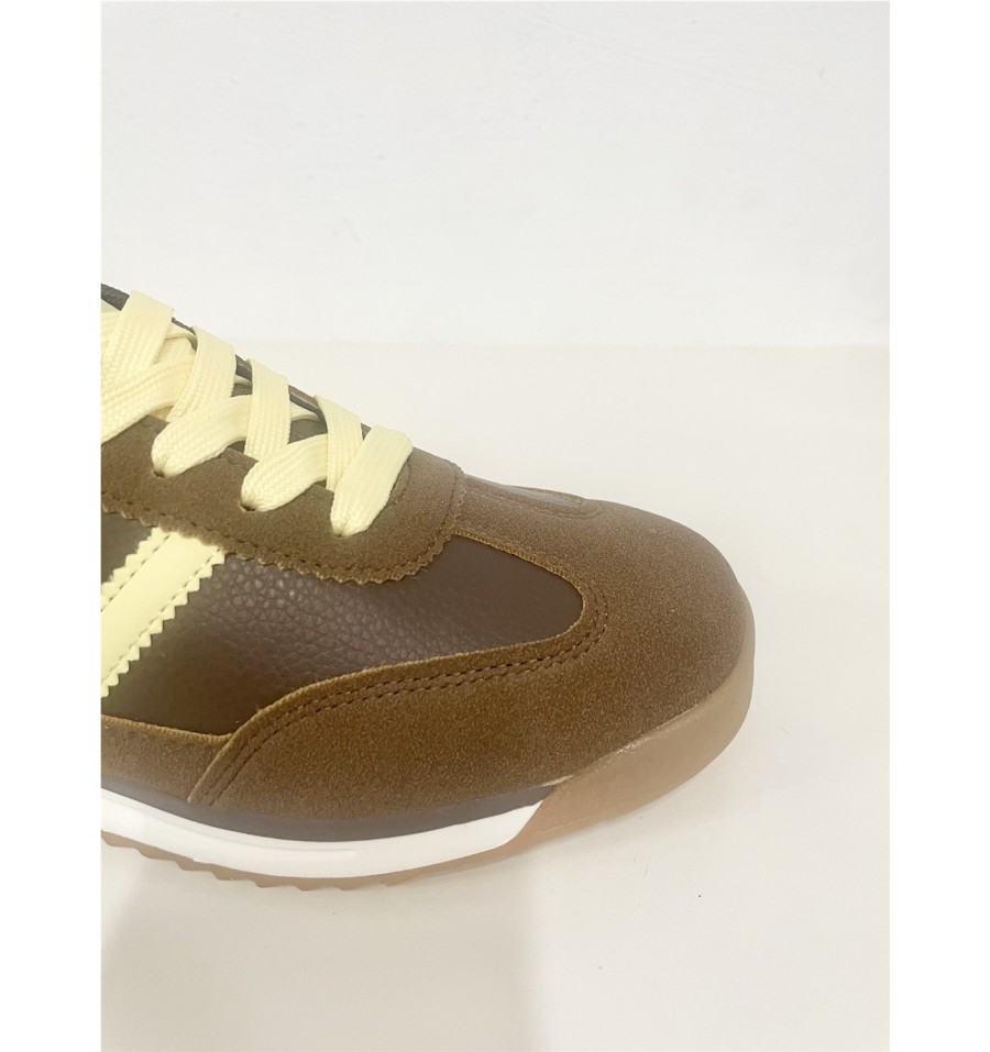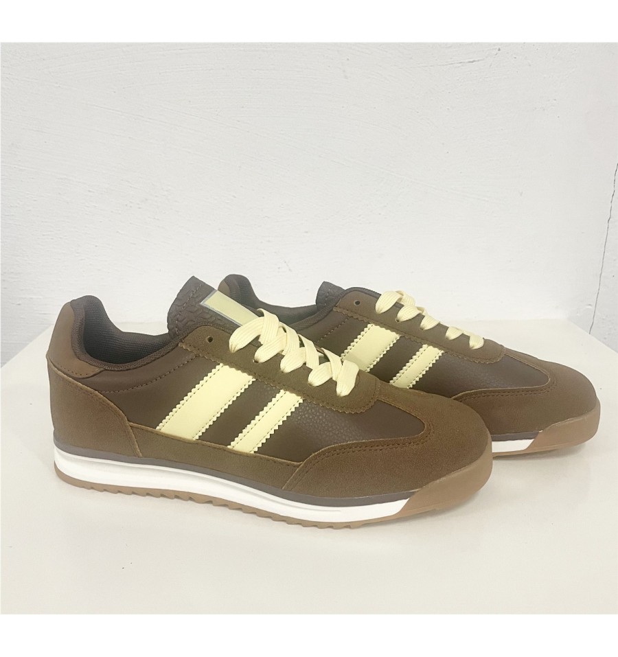 Deportivas con un diseño moderno y llamativo, ideales tanto para ropa deportiva o ropa casual. El contraste entre la polipiel marrón, el serraje de la puntera y añadido a los cordones amarillos con als bandas dde las zapatillas del mismo color añade un toque de interés hacía tus pies que elevara cualquier outfit