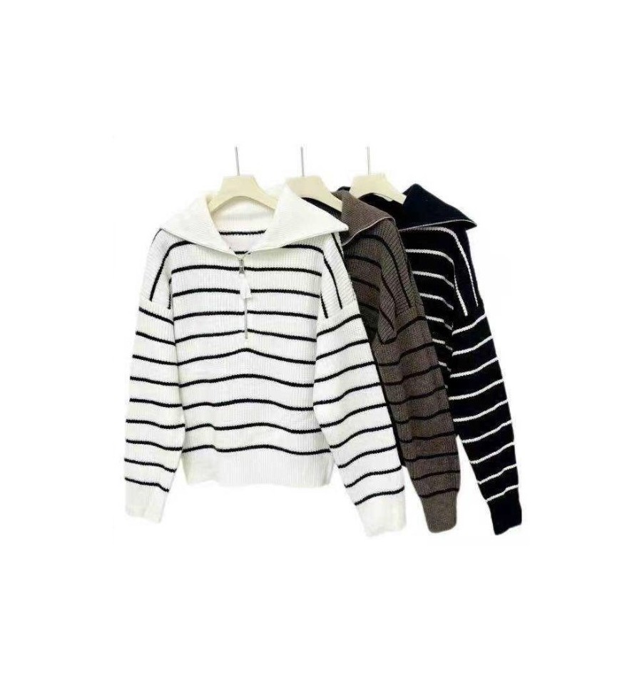 Suéter de listas de punto ejemplo de comodidad. Con un diseño clásico y relajado, este jersey es ideal para días informales. Cuello semicisne con cremallera que facilita a la hora de ponerse el suéter, acompañado de su suave punto es lo que necesitas para tu día